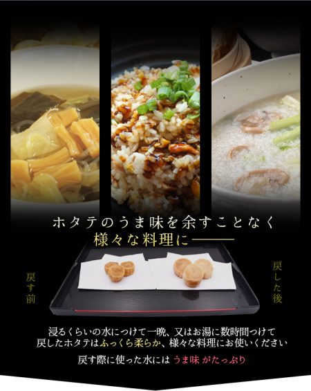 貝柱がかくれるくらいの水で半日ほど浸してからお召し上がりください。
